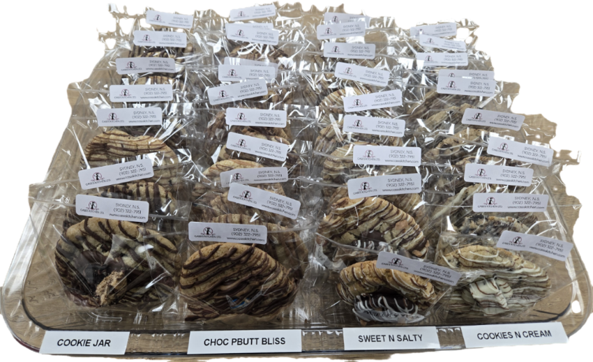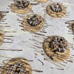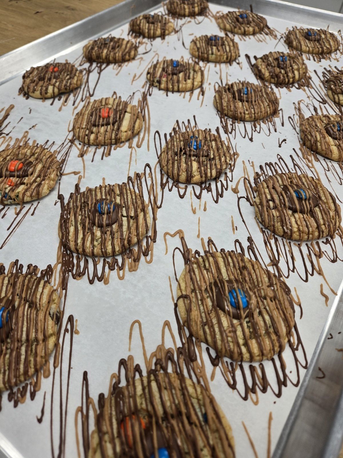 Semi Sweet chocolate, white chocola, peanut butter chips, m&ms. Topped with M&M, milk chocolate and peanut butter drizzle.